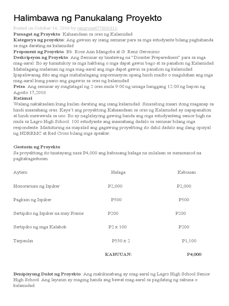 Panukalang proyekto kahaandaan sa oras ng kalamidad. August 1 2017 Grants Program Pormularyong PMD Blg. Ang gawain ay isang seminar para. KALIGIRAN NG PROYEKTO-ipaliwanag kung anong pangangailangan o problema ang ibig mong bigyang kalutasan.
